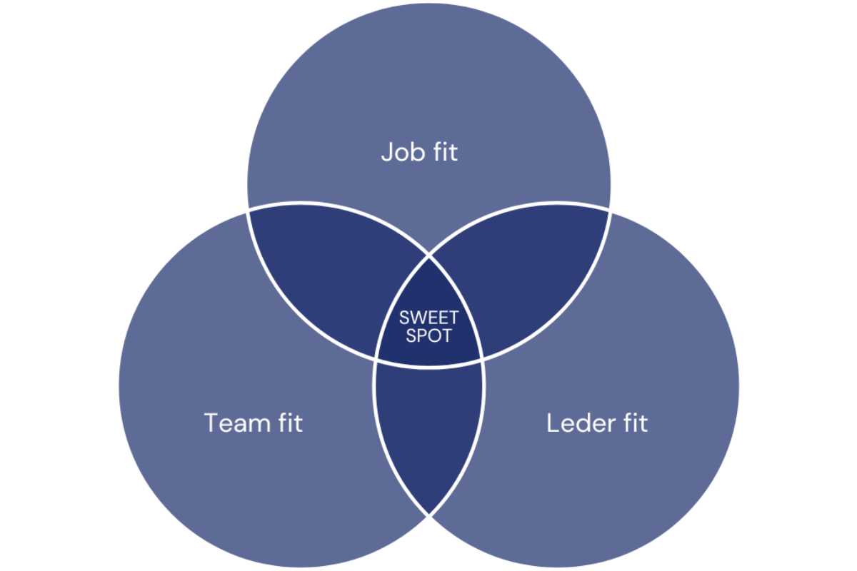 Når disse elementer overlapper, rammer vi the sweet spot – der hvor både kandidat og virksomhed lykkes bedst og hurtigt skaber værdi. Det er netop dette punkt, vores assessment-proces er designet til at identificere.